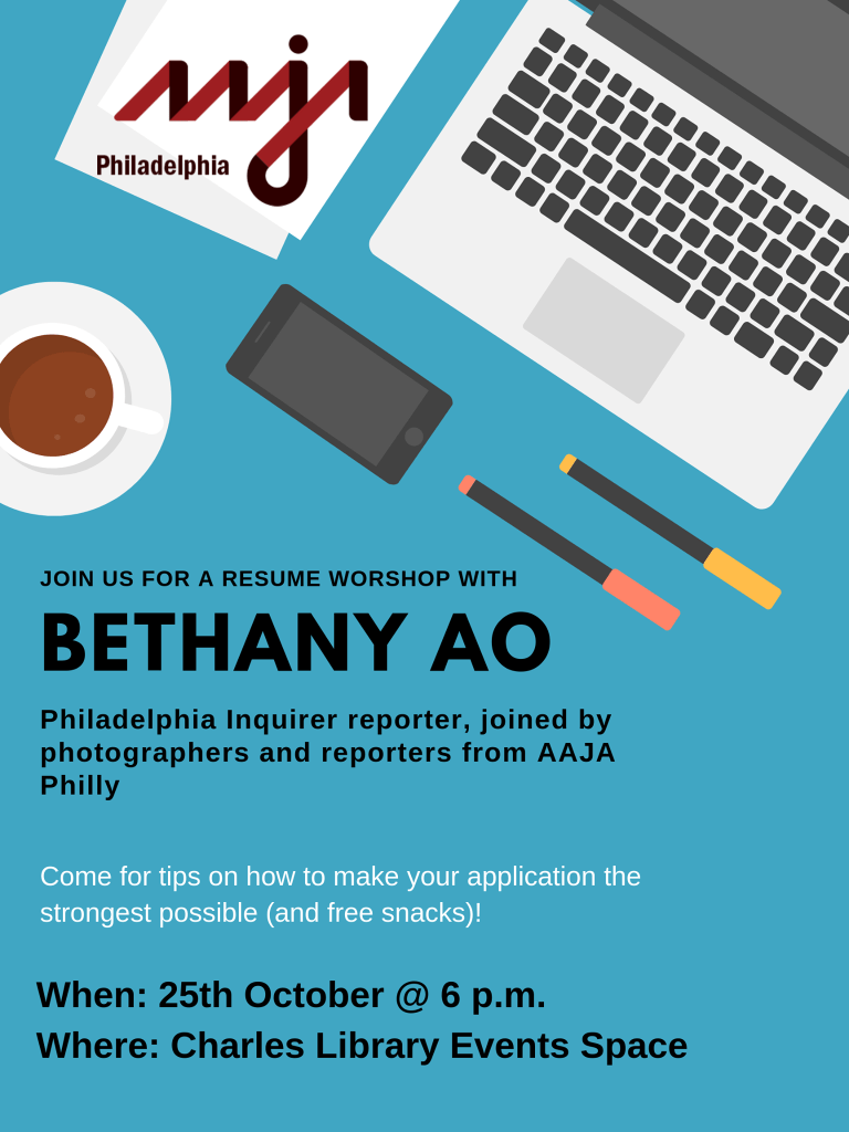 Hey students: We’re holding a resume and cover letter workshop! If you’re preparing to apply for media internships/jobs and want feedback on your application materials, join us at 6 p.m. on Friday, Oct. 25, at Temple University’s Charles Library Event Space. (And non-students, if you’d like to come help out at the event — look at resumes, talk about internships, interviews, etc. — please reach out to Bethany Ao at bethanyrao@gmail.com.) P.S.: We are thinking about karaoke afterward …