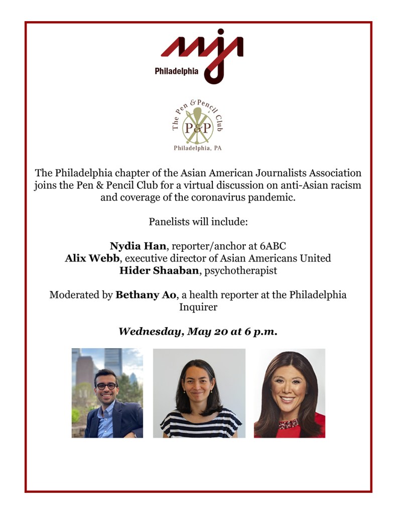 Join AAJA Philly and the Pen & Pencil Club on Wednesday, May 20, at 6 p.m. for a virtual panel on coronavirus coverage & anti-Asian racism, moderated by Inquirer reporter Bethany Ao. The panelists are Nydia Han of 6ABC, Alix Webb of Asian Americans United, and therapist Hider Shaaban. We’ll send out the Zoom link to our email list, but everyone is welcome to attend – email aajaphiladelphia@gmail.com if you would like the link.